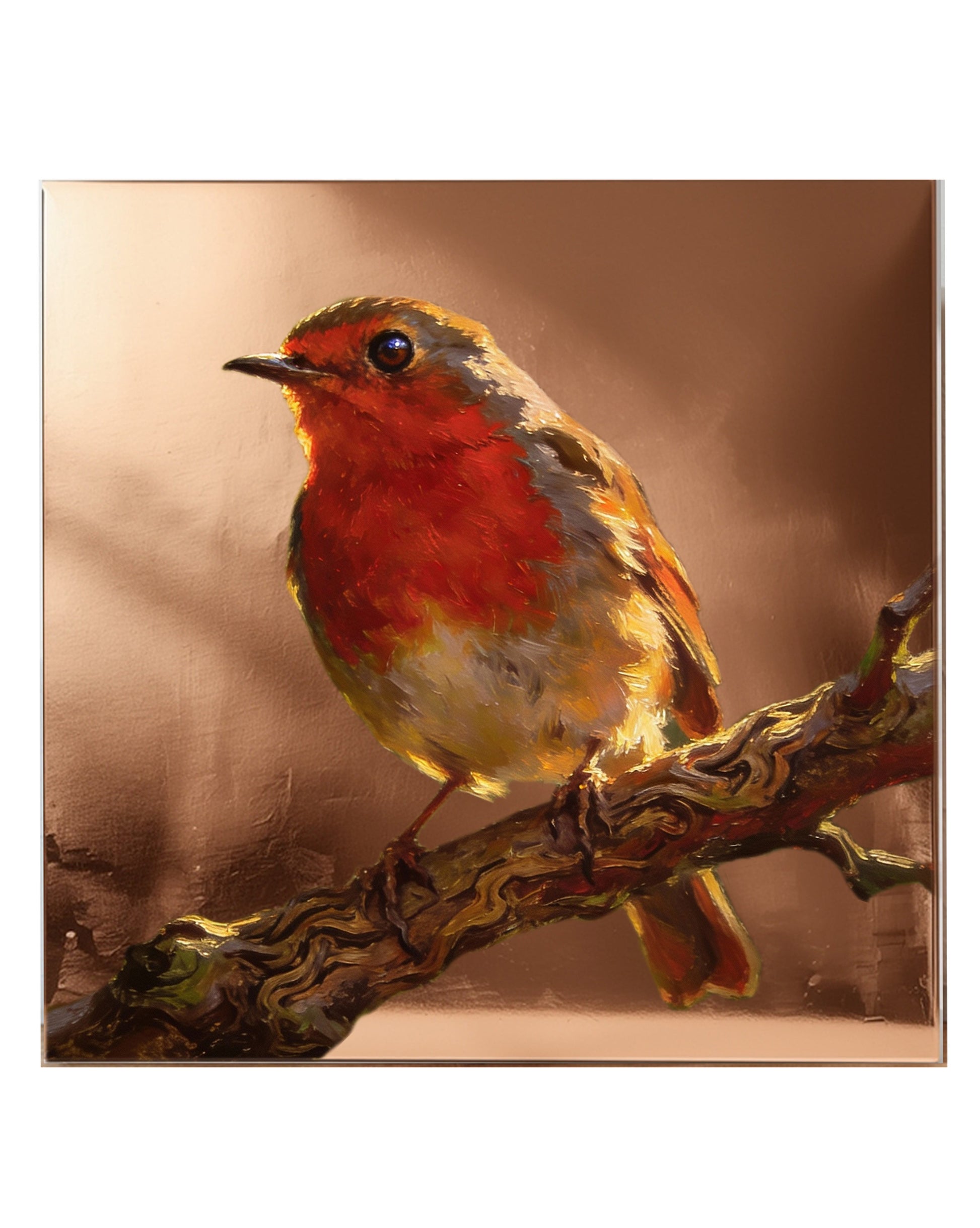 Bu 30×30 cm ölçülerindeki yağlı boya eser, kızılgerdanın sıcak ve canlı varlığını dingin bir doğa anı içinde ele alır. Dal üzerinde duran kuş, göğsündeki yoğun kırmızı tonlarla kompozisyonun odağı hâline gelirken, çevresindeki yumuşak toprak renkleri sahneye sakin bir denge kazandırır. Işığın kuşun tüylerinde yarattığı geçişler, hem hacmi hem de canlılığı hissettirir; arka planın sade tutulması ise figürün sessiz gücünü öne çıkarır.