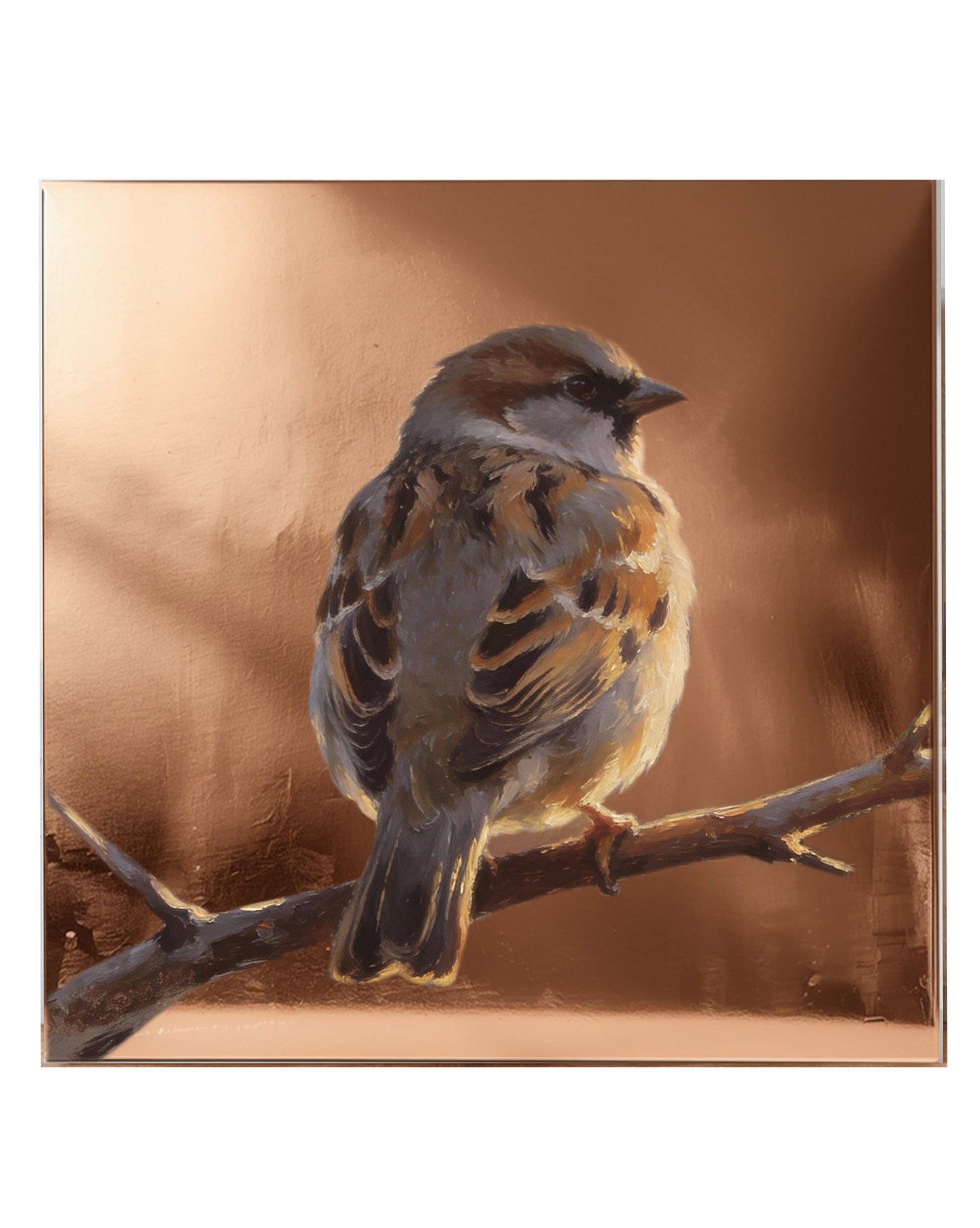Günün Ardından, 30×30 cm ölçülerinde yağlı boya bir çalışmadır ve günün son ışıklarıyla birlikte doğanın yavaşça durulduğu bir anı ele alır. Dala tünemiş serçe, arkasını izleyiciye dönmüş hâliyle sahnenin merkezinde yer alır; bu duruş, hem bir vedayı hem de sessiz bir kabullenişi çağrıştırır. Sıcak toprak tonları ve yumuşak ışık geçişleri, gün batımının dingin atmosferini resmin yüzeyine taşır.