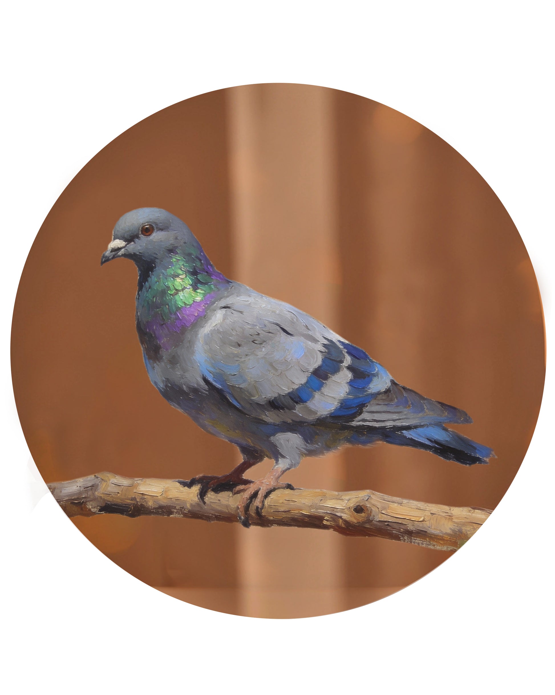 Bu 30×30 cm ölçülerindeki yağlı boya eser, güvercinin yakın plandan portresi aracılığıyla sakinlik ve zarafeti ön plana çıkarır. Kuşun baş ve boyun bölgesinde kullanılan gri, mor ve yeşil tonlar, ışıkla birlikte yüzeyde yumuşak geçişler oluşturur. Arka planın sade ve sıcak tutulması, figürün ifadesini güçlendirirken bakışın doğrudan kuşun gözünde yoğunlaşmasını sağlar. Kompozisyon, gündelik bir varlığı dingin ve neredeyse anıtsal bir duruşla ele alır.
