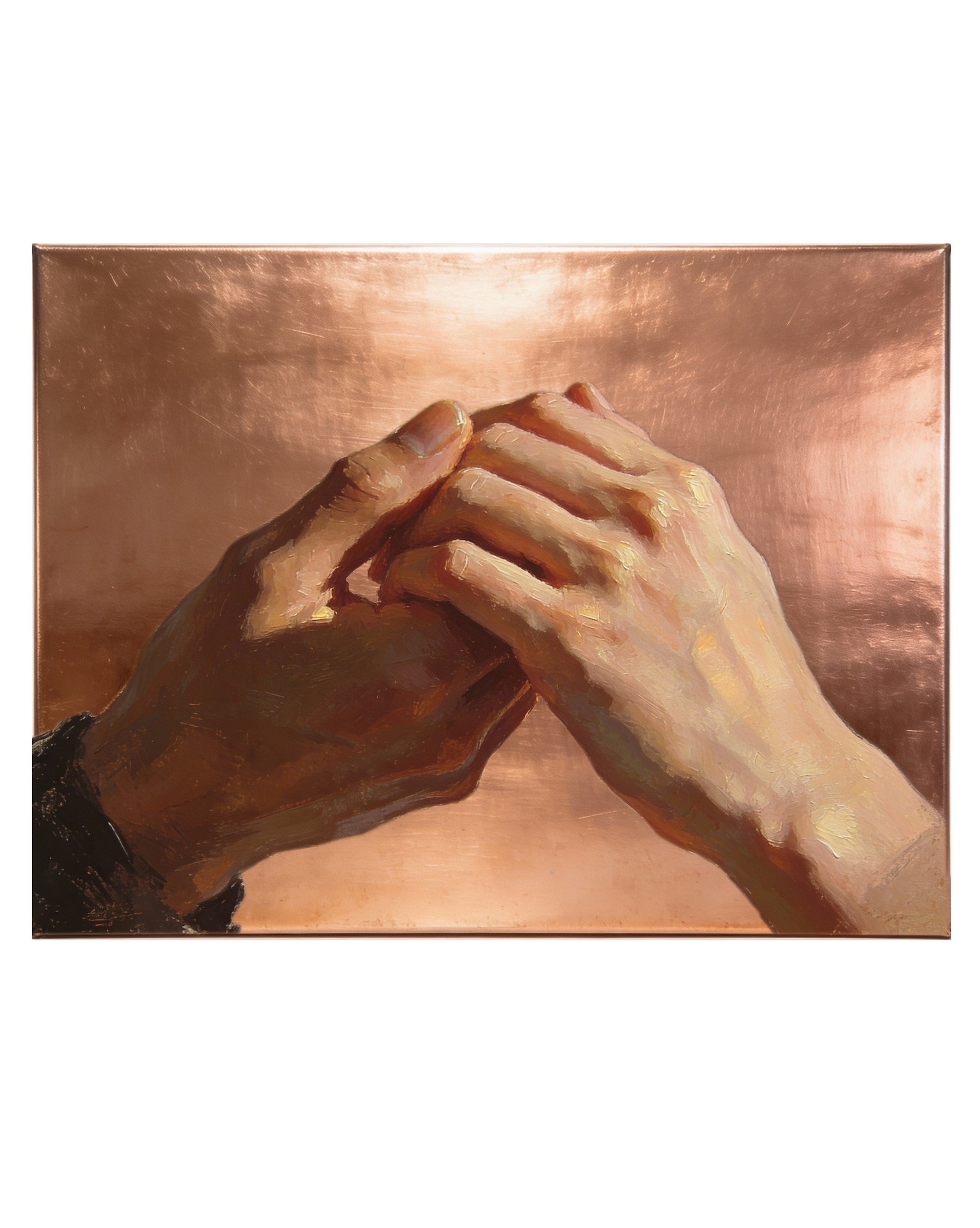 ‘Birlikte’ eseri, 50x70 cm ölçülerinde bakır tuval üzerine yağlı boya tekniğiyle gerçekleştirilmiş, insan temasını en yalın hâliyle ele alan anlatımsal bir çalışmadır. Kadrajda yalnızca iki elin birbirine dokunuşu yer alır; yüzler, bedenler ve mekân bilinçli olarak dışarıda bırakılmıştır. Tenin sıcaklığını ve anın kırılganlığını fiziksel bir duyum hâline getirirken, bakır tonlu zemin ışığı yumuşak biçimde geri yansıtarak sahneye zamansız bir derinlik kazandırır.