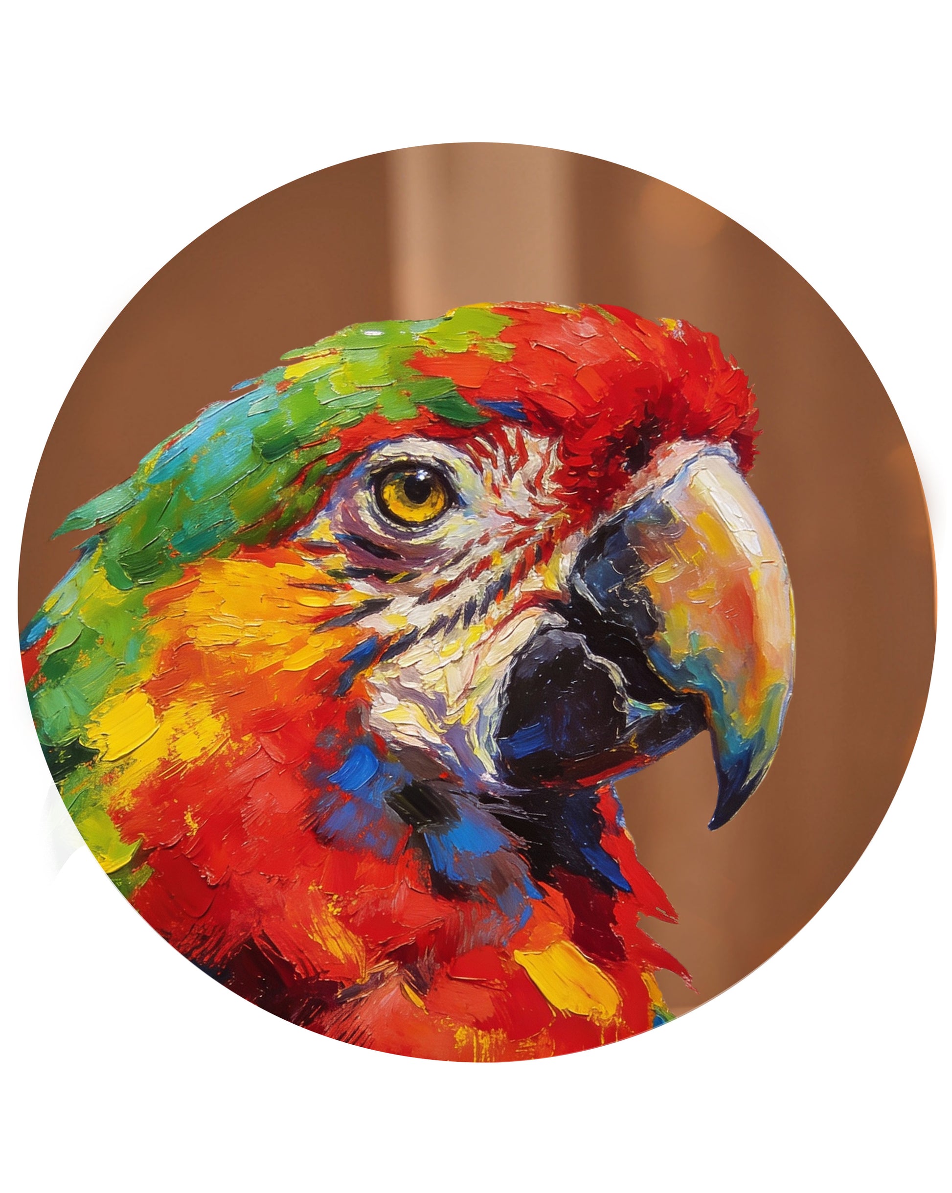 Bu 30×30 cm ölçülerindeki yağlı boya eser, papağanın baş portresi üzerinden rengin ve karakterin gücünü yoğun bir anlatımla ortaya koyar. Kırmızı, sarı, yeşil ve mavi tonlar cesur fırça darbeleriyle yüzeyde katmanlanırken, kuşun bakışı kompozisyonun merkezine yerleşir. Arka planın sade ve sıcak tutulması, figürün renk patlamasını daha da belirgin kılar; papağanın başı adeta resmin içinden dışarı taşan bir enerji alanı oluşturur.