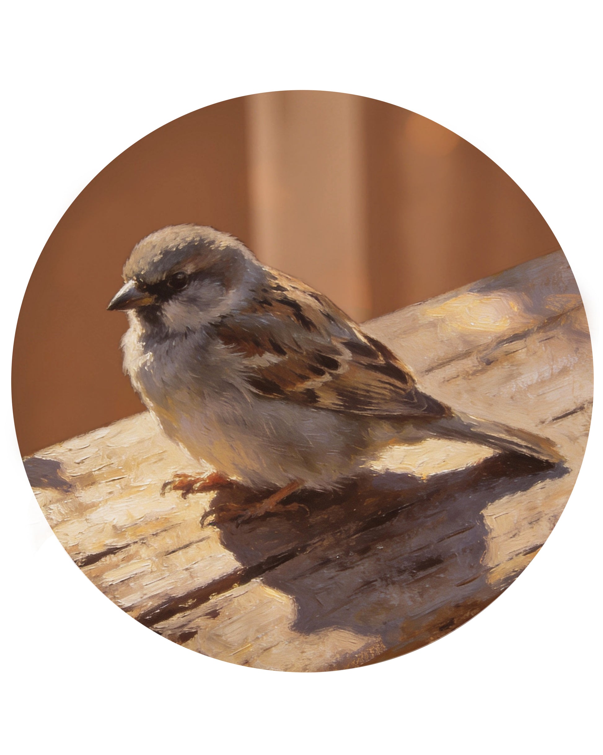 Bu 30×30 cm ölçülerindeki yağlı boya eser, gündelik yaşamın içinden alınmış sade bir anı dingin ve şiirsel bir dille ele alır. Ahşap bir yüzey üzerinde konumlanan serçe, doğanın gösterişsiz ama en samimi varlıklarından biri olarak kompozisyonun merkezinde yer alır. Yumuşak gün ışığı, kuşun tüylerinde sıcak tonlar oluştururken arka plandaki flu renk geçişleri sahneye derinlik ve sessizlik katar.